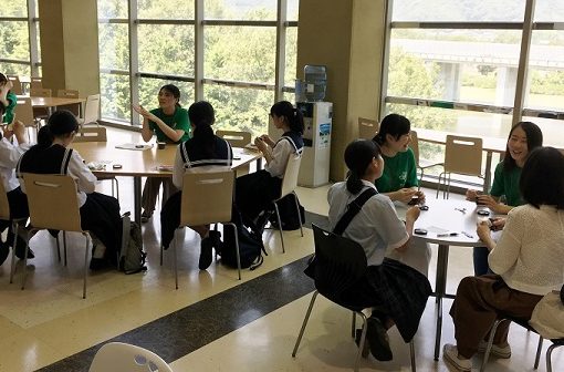 教員、学生、高校生、保護者が1つのグループを作り、医療薬学教育センターの施設見学を行いました。その後、グループごとに食堂に向かい、話をしながら楽しく食事をしました。さらに、ガールズトークのコーナーでは、3人の女子薬学生が食事を終えた女子高生の質問に対して親身に答えていました。