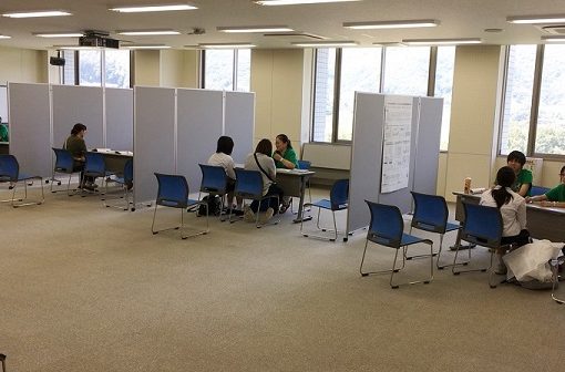 鶴田泰人-薬学部長、井上敦子-薬学研究科長自ら相談員として保護者に対して説明していました。学生も個別相談の一員に入り、保護者からの質問に答えていました。学生の生の声が聞けて、うれしそうでした。