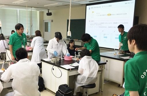 実際に実験をしてみると、なかなか難しいようでした。色の変化に感動する高校生もいました。大学に来ると、こういった実習をすることも分かってもらえたかな。