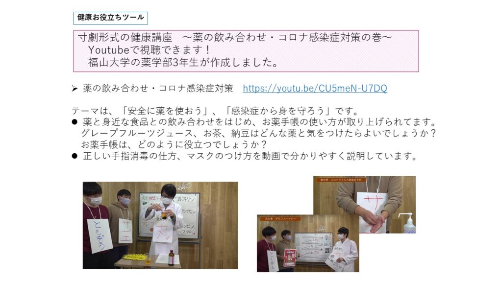 また、健康お役立ちツールもあります。こちらでは、学生が作成した寸劇形式の健康講座が見られます。是非ご覧になってみてください。また、来春にはさらに二つの寸劇をアップする予定だそうです。