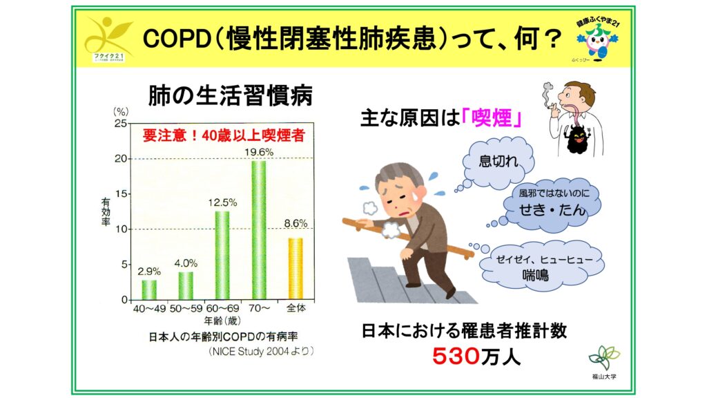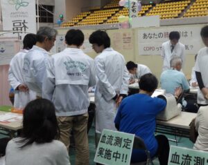 今回のフェスティバルでは “イエローグリーンリボン運動の推進(受動喫煙防止と禁煙の推進)” がサブテーマになっています。イエローグリーンリボン運動については、本学の多くの教職員がネームカードにつけて、啓発に協力しています。薬学部は、このサブテーマに関連した喫煙が主な発症原因であるCOPDについて、”COPD(慢性閉塞性肺肺)って何?”をテーマに出展しています。