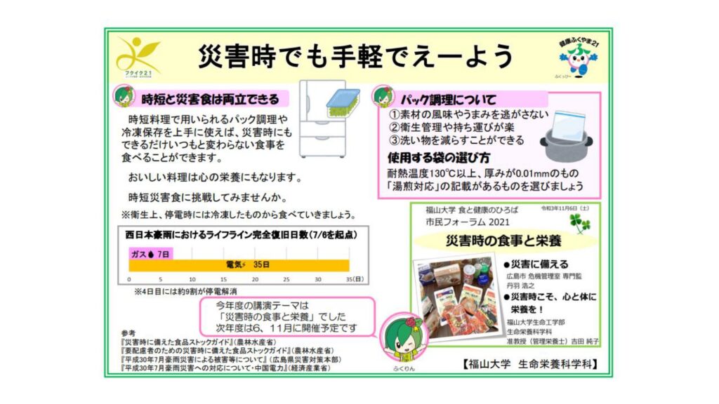 その他、福山大学は、生命栄養科学科や心理学科からも出展しています。生命栄養科学科は“災害時でも手軽でえーよう”をテーマに、中崎千尋助教を中心として時短災害食等を紹介しています。