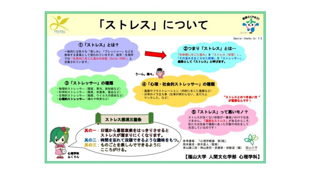 心理学科は、”「ストレス」について”をテーマにして、山崎理央教授を中心に、ストレッサーの種類やストレスとのつきあい方の重要性、ストレス解消三箇条について紹介しています。
