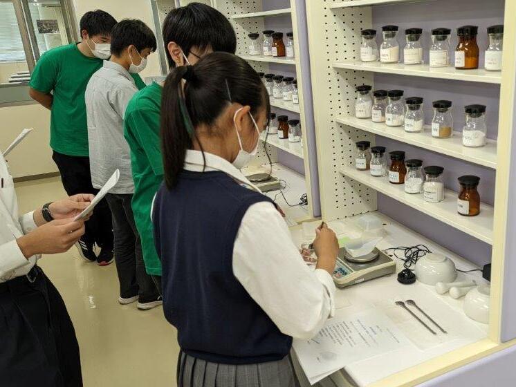 今回の体験入学会はグラニュー糖を使用した散剤(粉薬)の調剤です