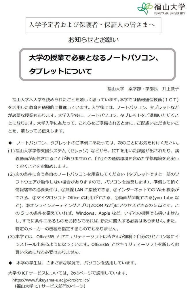 「福山大学薬学部での個人所有デジタルデバイスを利用した学修(BYOD)とノートパソコンの準備についてのご案内」