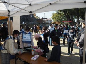 受付でチェックポイントマップを参加者へ配布している学生スタッフ