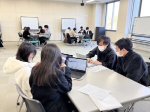 フィールドワークの事後学修では、各グループでそれぞれの課題テーマについてSGDにより体験内容をパワーポイント資料にまとめました。早朝よりイベントを一緒に体験したこともあり、楽しく積極的に意見交換を行っている様子でした。