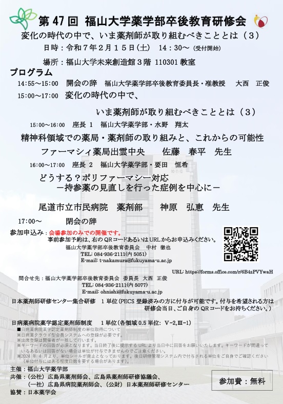 【イベント】福山大学薬学部 卒後教育研修会の案内(開催:2025年2月15日)