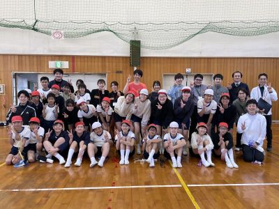 当日、学生はニックネームを胸に貼り、花田さんの司会のもと学生の自己紹介から始まりました。交流会では、‘角師匠’の縄跳び披露、NiziUパフォーマンスの他、持久対決、30秒で何回跳べるか、縄跳びリレーなどを行いました。もちろん大学生も参加!縄跳びリレーは、小学生と大学生混合の6チームと角師匠ひとりチームとで競争しました。小学生も大学生も角師匠も全力です!