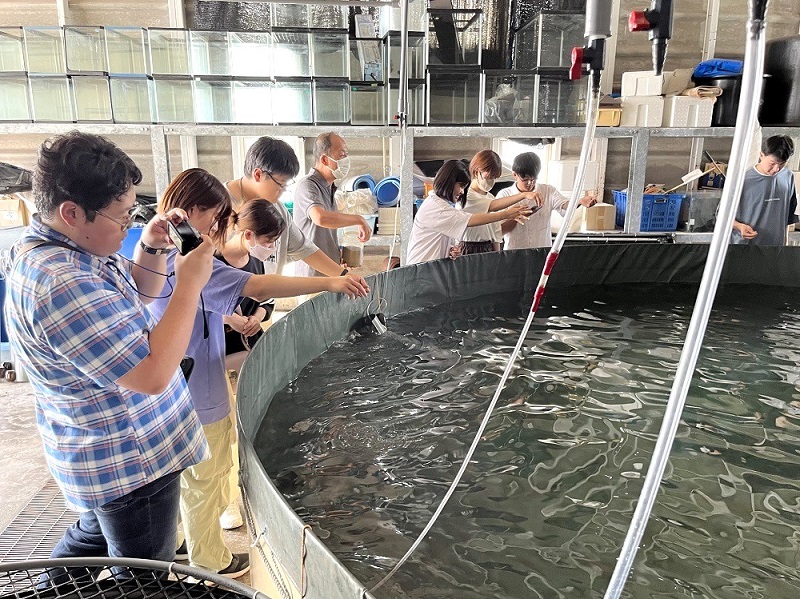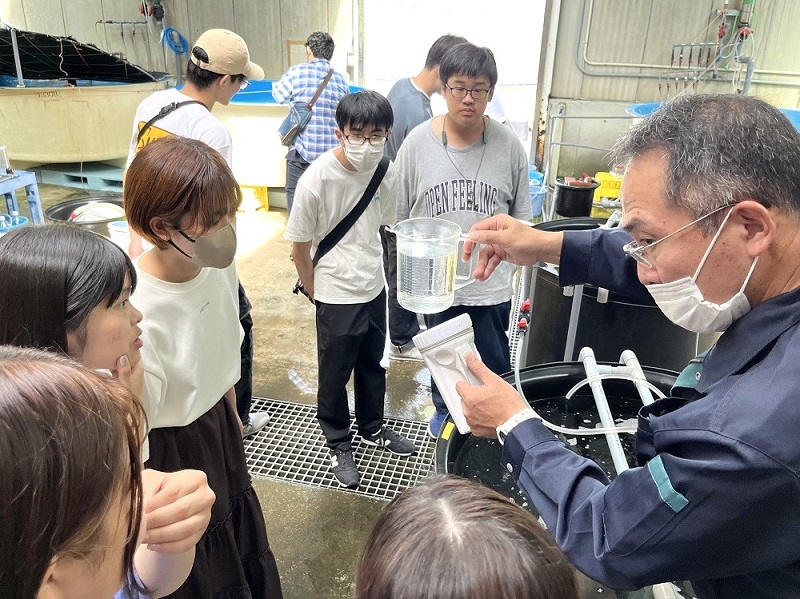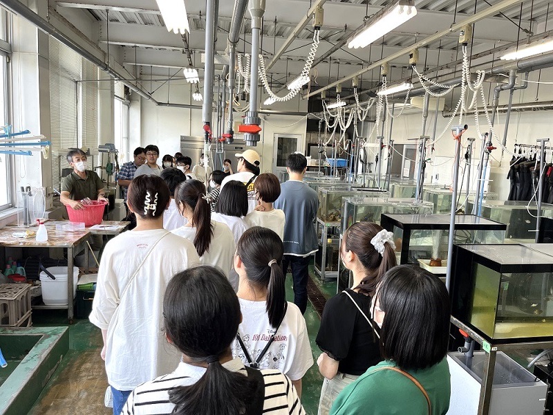その後は研究施設に移動して、シロギスやオニオコゼ、キジハタ等の養殖技術についてのお話を伺いました。福山大学内でこのような研究が行われていることに驚き、普段聞けない話に皆興味津々でした。