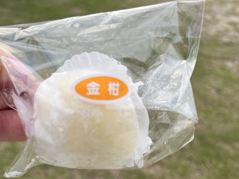 朝食後、因島大橋を歩いて渡りに行きました。因島大橋に向かう途中にある因島名物の “ はっさく大福 ” のお店を目指しましたが、はっさく大福の販売期間は10月からだそうで、その代替品として “ きんかん大福 ” をいただきました。こちらも、美味しかったです。