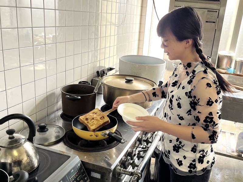 朝食は、ハムやチーズをはさんだホットサンドや、フレンチトーストなど、各自が好きなものを作って食べました。とくに、フレンチトーストがとても美味しかったです。