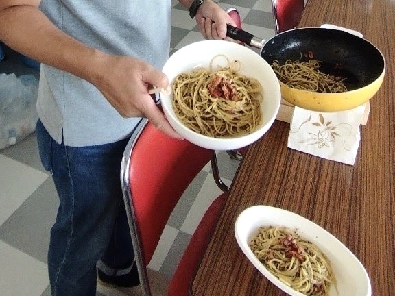 昼食は、カレーライスを食べました。カレーライスのおかずに、引率の松岡先生がバジルとベーコンのジェノベーゼパスタを作ってくださり、みんなで分けていただきました。美味しかったです。