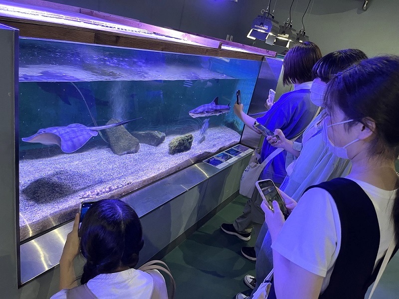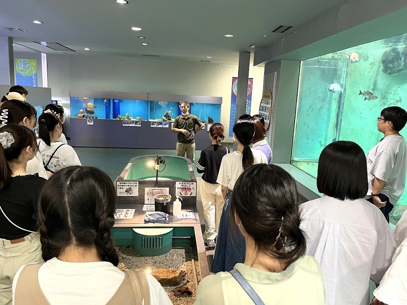はじめに、内海生物資源研究所の水上講師に水族館について説明していただきました。毎年、1万5千人以上もの来館者が訪れるそうで、この水族館を活用して、水族館や動物園などの専門的職員である学芸員の養成コースがあることを知りました。