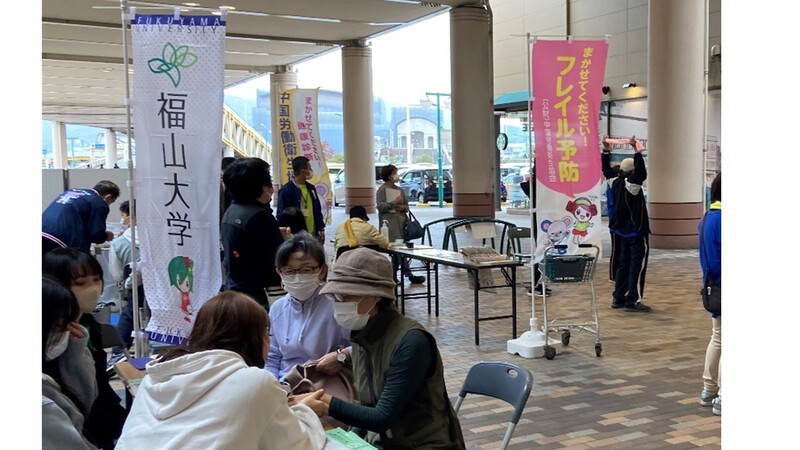 今年度のメインテーマは、健康寿命の鍵を握る“フレイルを予防しよう!”でした。このフェスティバルには、本学学生もセルフメディケーションの授業の一環として参加し、ヘルスプロモーションの観点から、地域の健康づくりについて体験しました。この体験を通して学修したことについて、12月の授業で学生達はプレゼンテーションをおこないます。福山大学からは、心理学科、生命栄養科学科、薬学科の3学科が出展しました。