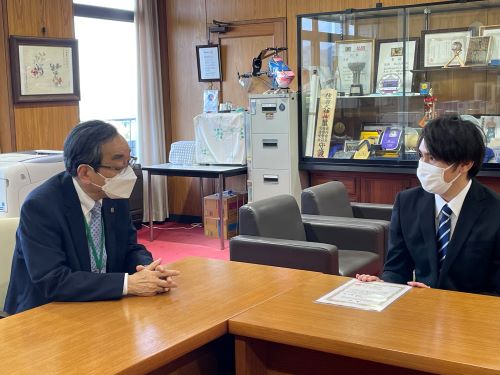 受賞に伴い、井上薬学部長とともに大塚学長に表彰の報告を行いました。中谷君から研究の背景や結果、今後の展望について説明し、学長から激励をいただきました。