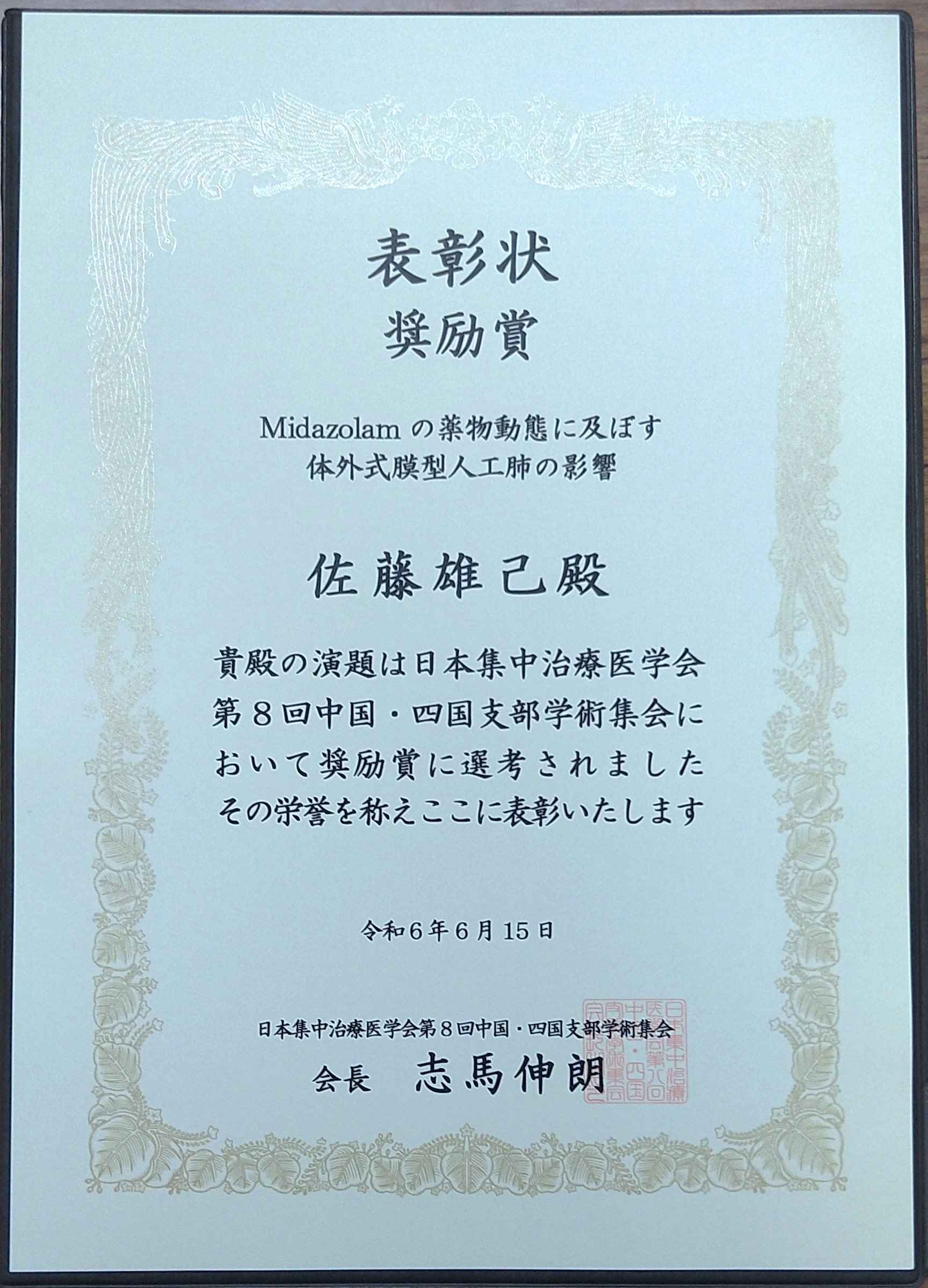 2024年6月15日に広島市にて開催された日本集中治療医学会第8回中国・四国支部学術集会において、薬学部臨床薬効解析学研究室の佐藤雄己教授が口頭発表し、優秀演題賞(奨励賞)を受賞しました(審査対象演題118題中、最優秀賞1題、奨励賞3題)。このことについて、佐藤雄己教授からの報告です(投稿は五郎丸です)。