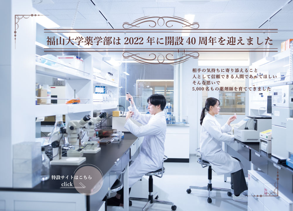 福山大学薬学部は、1982年(昭和57年)の開設より40年以上に亘り、日本で最初の「医療薬学教育の実践」を教育理念とする薬学部として、5,000名を超える数多くの薬剤師を輩出してきました。本学部の医療薬学教育システムは、「福山大学方式」として全国に先駆けて確立され、薬学教育現場や医療現場から高く評価されています。その内容は、2006年(平成18年)から始まった6年制薬学教育に大きく引き継がれ、次のような学習内容に発展しました。①薬学教育過程に対応した最新の設備を備えた医療薬学教育センターの設置、②「病院・薬局実務実習プレトレーニング(事前学習)」の充実化、③病院・薬局実務実習終了後に知識・技能・態度をさらに深めるための実務実習後学習の確立などです。
