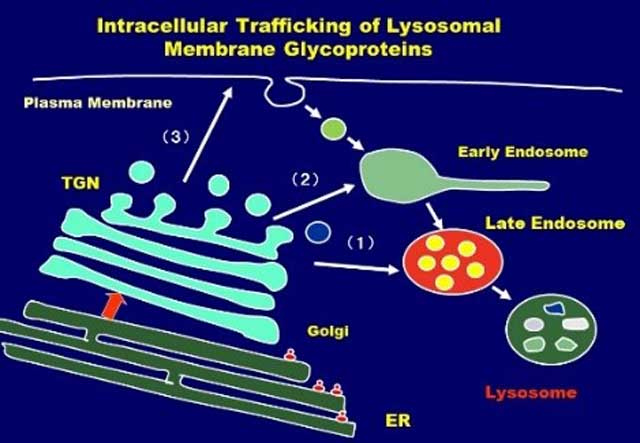 当研究室ではリソソームの袋に相当するリソソーム膜に多量に含まれる糖タンパク質(lysosome-associated membrane protein: LAMP, lysosomal integral membrane protein: LIMP)の機能、リソソームへの局在化機構の研究を行っています。