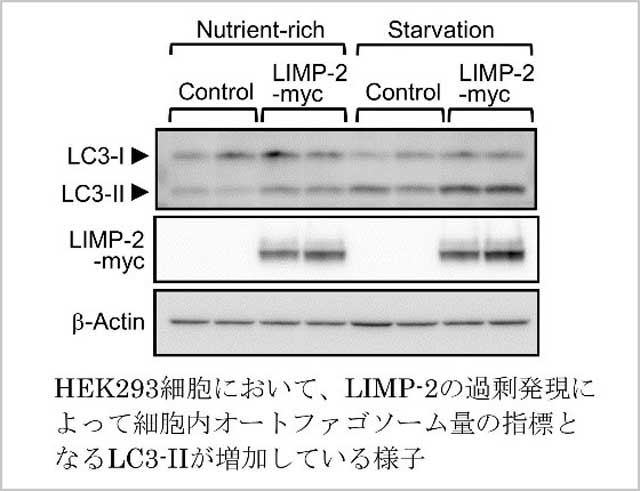 マクロオートファジーは、飢餓条件などにおいて細胞が自己成分を分解する機能であり、近年、オートファジーが神経変性疾患やがんなどの疾患に関わることが明らかになっています。自己成分を分解するときにはリソソームと呼ばれる細胞小器官が重要な働きを担いますが、リソソームには様々な膜糖タンパク質が存在しており、それらはオートファジーの制御に関わっています。私たちの研究により、主要なリソソーム膜糖タンパク質の一つであるLIMP-2がオートファジーの過程で起こるオートファゴソームの形成に関わることが明らかになり、オートファジーにおけるLIMP-2の機能の解析をさらに進めています。
