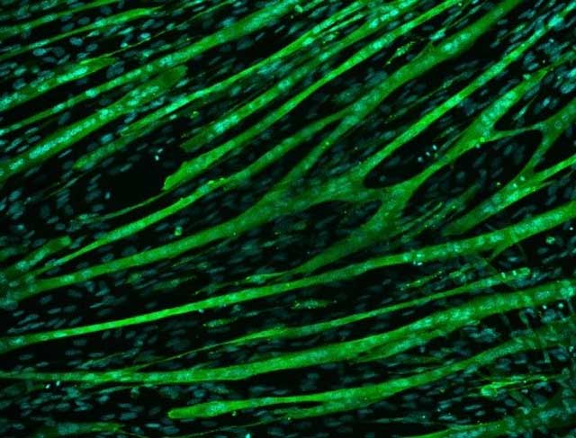 骨格筋は人体の運動に関わる組織であり、骨格筋の発生では、単核の細胞である筋芽細胞同士が融合することで多核の筋管細胞が形成され(左図:緑色;筋管細胞、青色;細胞の核)、そして筋管細胞が筋線維へと成熟していきます。筋芽細胞から筋管細胞への分化には細胞小器官であるリソソームに存在するタンパク質が関わることが知られており、骨格筋の発生メカニズムを明らかにすることを目指して、筋細胞の分化におけるリソソーム膜糖タンパク質の機能を研究しています。