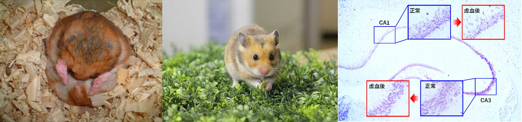 薬理学研究室(Laboratory of pharmacology)ではシリアン・ハムスターによるin vivoの実験を中心に大きく2つの研究テーマを展開しています。1つはハムスターの冬眠を制御する中枢神経機構の解明、もう一つは虚血再灌流により誘発される神経細胞死の発現機序とタンパク質SUMO化修飾による神経保護機構の解明です。冬眠機構の実験は、脳低温(低体温)療法など薬物による新たな体温制御の確立を、虚血再灌流実験は、脳卒中後の高次脳機能障害の抑制方法の確立を目指しています。研究室のモットーは「カニの横ばいよりもカメの前進」です。手間のかかる研究ですが、研究室全員で一歩一歩着実に前進していきたいと思っています。
