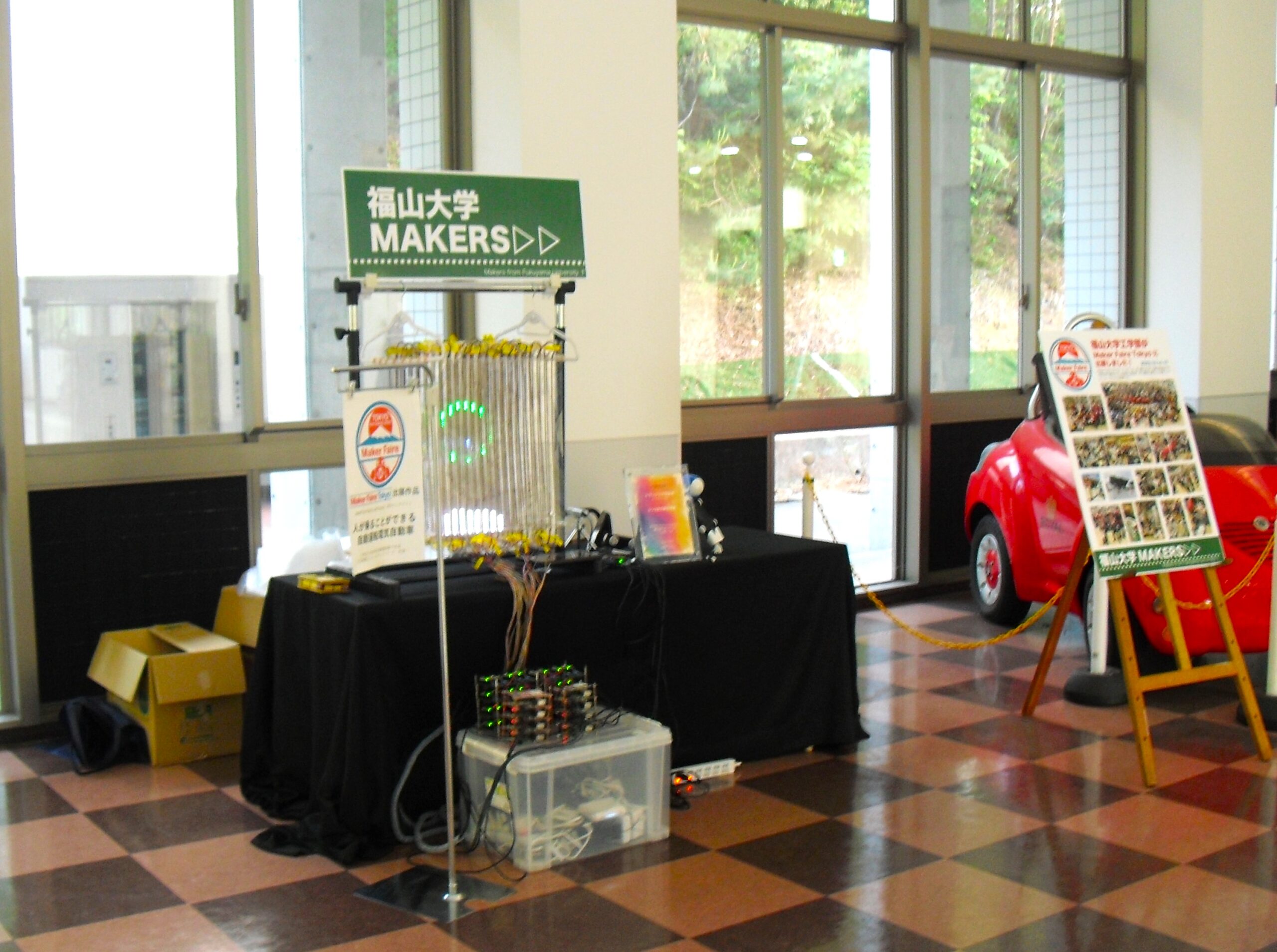 さて、今回展示した「福山大学MAKERS」のブースですが、工学部棟エントランスホールに一部展示中です。今年は、6/22,7/20,8/18,9/7 に開催されるオープンキャンパスにも展示されますので、是非見に来てください!
