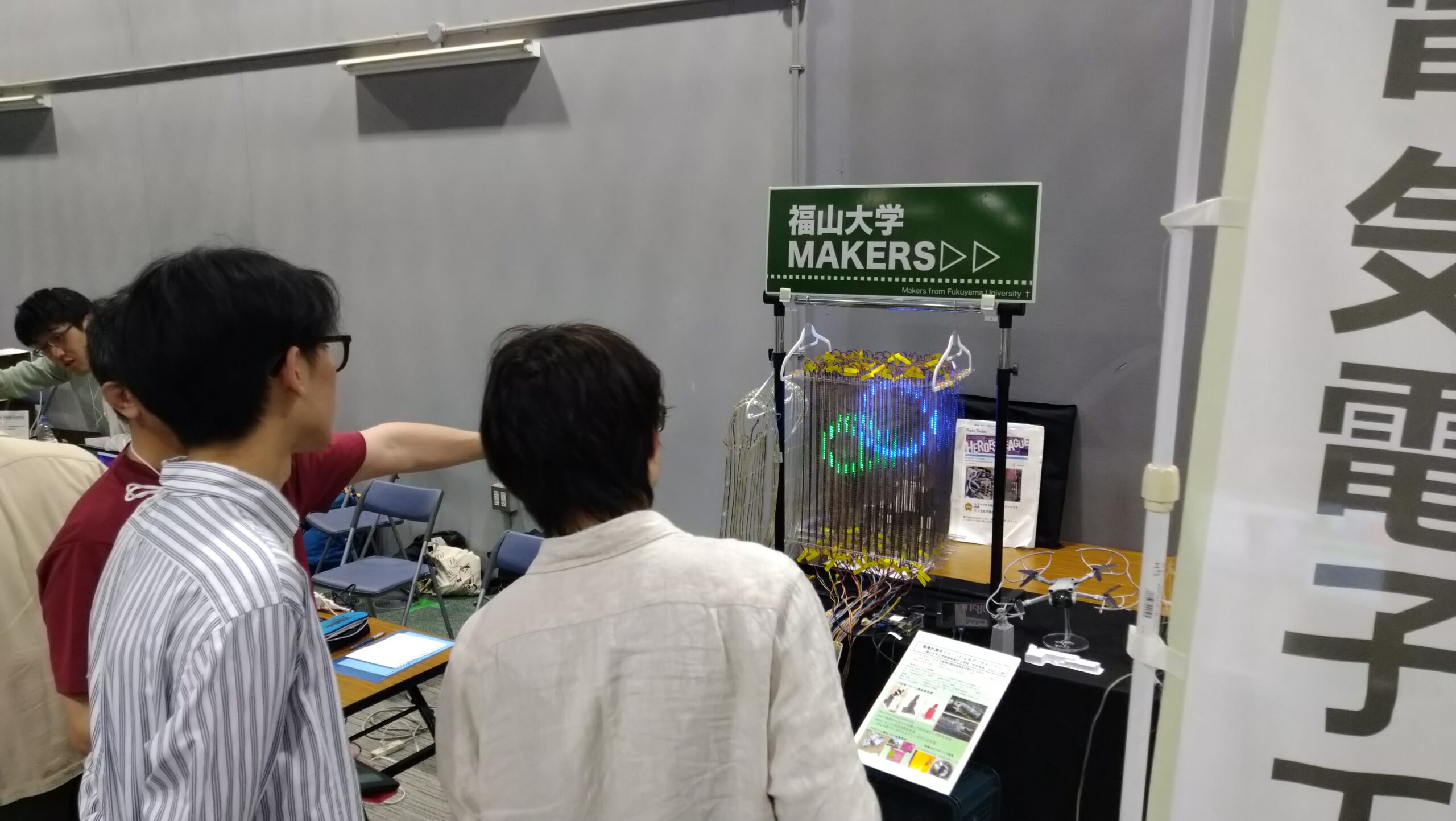 福山大学MAKERSのブース。山之上教授のシン・3次元表示装置が目を引きます