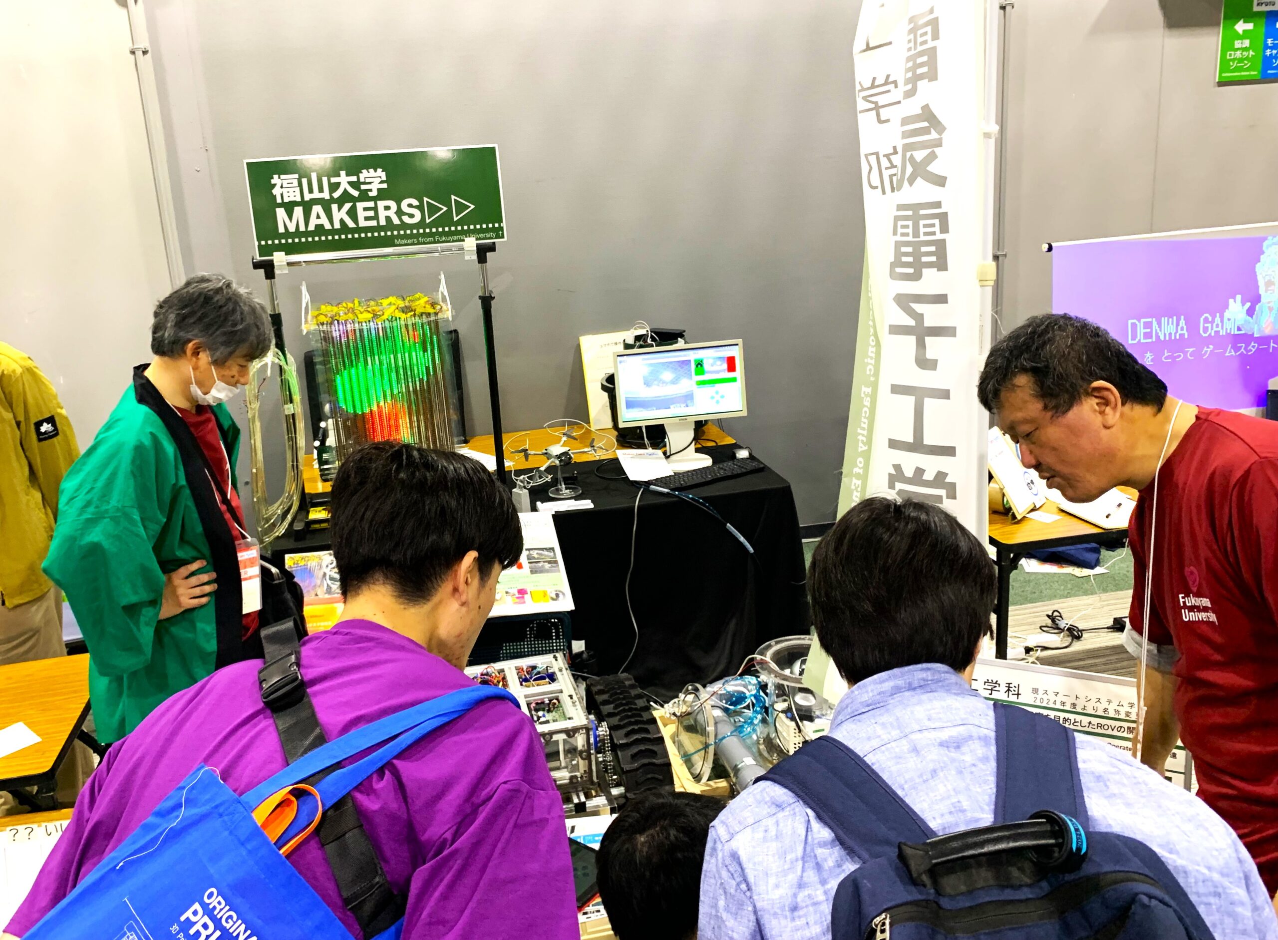 今回出展した「福山大学MAKERS」ブースでは、工学部4学科の研究内容が紹介され、特に情報工学科・山之上教授の「シン・3次元表示装置」、「テレポートドレッサー」等のLED表示デバイス、電気電子工学科・沖准教授が開発している「中生物観察無限軌道(海中ROV)」が来場者の耳目を集めていました。