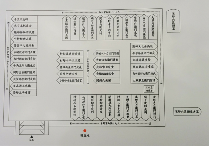 仇討ちの決意を見破られまいと、隠棲先の京都山科の茶屋での遊興三昧の虚け者を演じた大石内蔵助、討ち入り前夜に兄の家を訪ね、不在の兄の羽織の前で持参した酒を酌み交わそうとした「徳利の別れ」の赤垣源蔵、浪曲歌謡「俵星玄蕃」に登場する杉野十平次など、映画のシーンとともに名前がすぐに頭に浮かぶ人たちが少なくありません。前に写真に撮っておいた泉岳寺境内の案内図に見られるように、切腹した義士たちが主君とともに揃って祀られています。