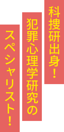 前職は「科捜研」で勤務し、現場の捜査員の皆さんと事件解決に全力を尽くしてきました。何百、何千もの事故事件に対応してきた実務経験を存分に活かしながら、捜査に活かされる心理学の実情を正しく伝えること、その上で現状の課題や問題点を整理し、その解決方法を探ること、そして新たな知見や発見を通じて、より良い技術を提供することを目指した教育、研究に取り組んでいます。主に脳波や自律神経系活動などの生理指標を用い、犯罪捜査で活用されるポリグラフ検査(隠匿情報検査)の実験的研究を行っている他、正しい情報をいかに引き出すかに主眼を置いた取調べ手法に関する研究、安全・安心まちづくりのための調査研究なども行っています。