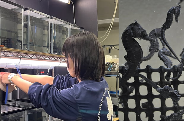 大学4年生の時から今に至るまで、魚を飼育する生活に人生の半分以上を費やし、学生時代は養殖魚に被害を与える魚病について学んでいました。そのきっかけは「水族館で魚を飼育するには、きっと病気の問題もあるはず」との思いも少なからずあったため、「水族館」のキーワードは私の専門から外すことはできません。水族館は博物館施設の一つで「学びの場」ではありますが、まずはその展示資料の保存となる「水生生物の育成」がベースにあります。そのため、飼育、分類、餌、繁殖、病気など生物に直接関わることだけでなく、水質、設備、展示手法、環境、教育など幅広い分野の知識や技能が要求され、電動工具を手に自分の使いたい水槽を自作する場面も多くあります。水族館に関わることには広く取り組んできましたが、タツノオトシゴ類の繁殖と、学生時代の経験を活かして水族館でも対策が必要なスクーチカ症と呼ばれる寄生虫症に関する研究が主なテーマです。